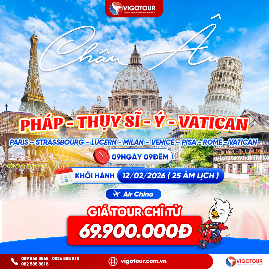 DU XUÂN BÍNH NGỌ – 2026 KHÁM PHÁ CHÂU ÂU QUA HÀNH TRÌNH PHÁP – BỈ – HÀ LAN – LUXEMBOURG – THỤY SĨ – ĐỨC Thời gian: 09 ngày 09 đêm (Lưu trú tại Châu Âu...