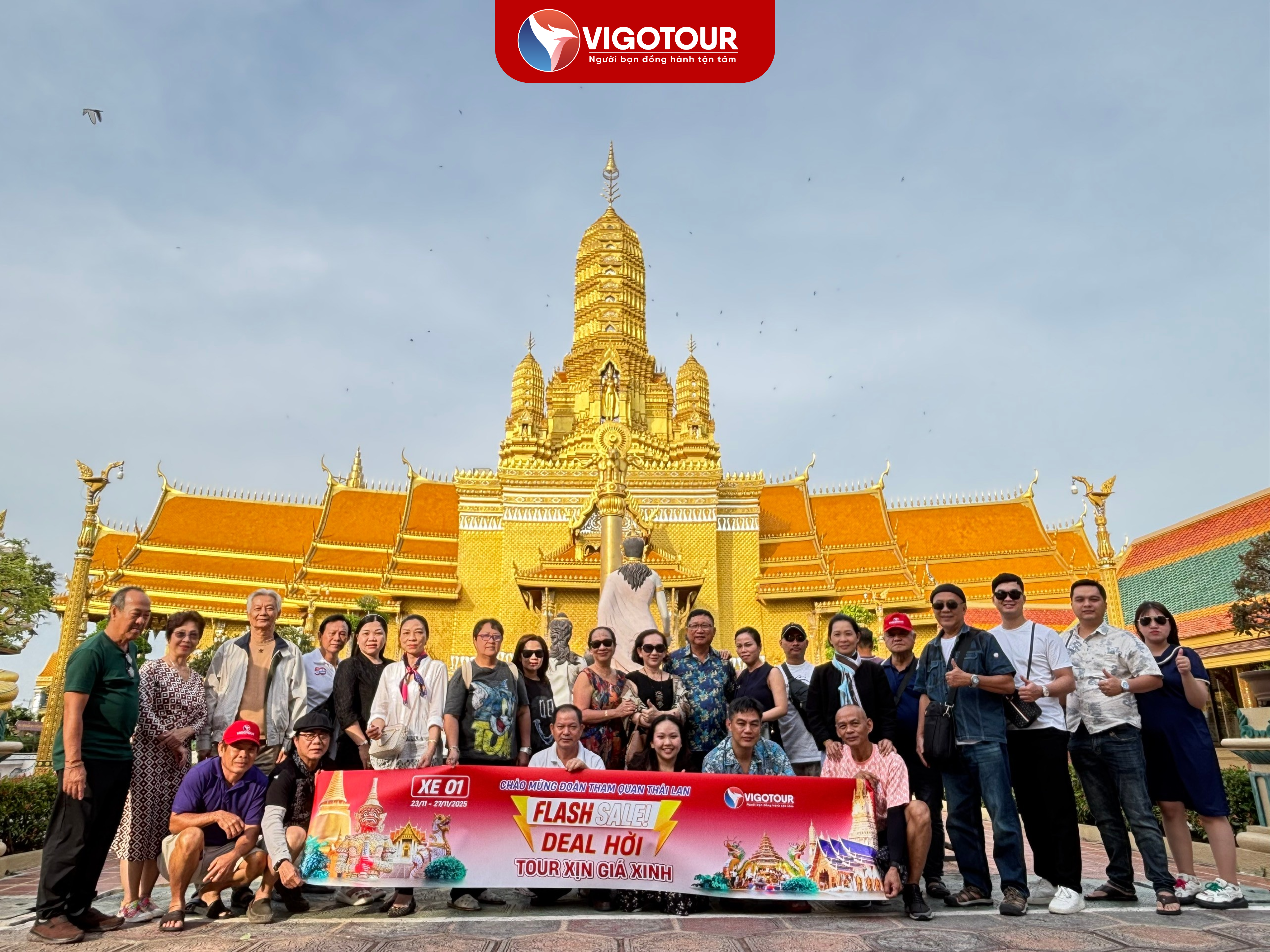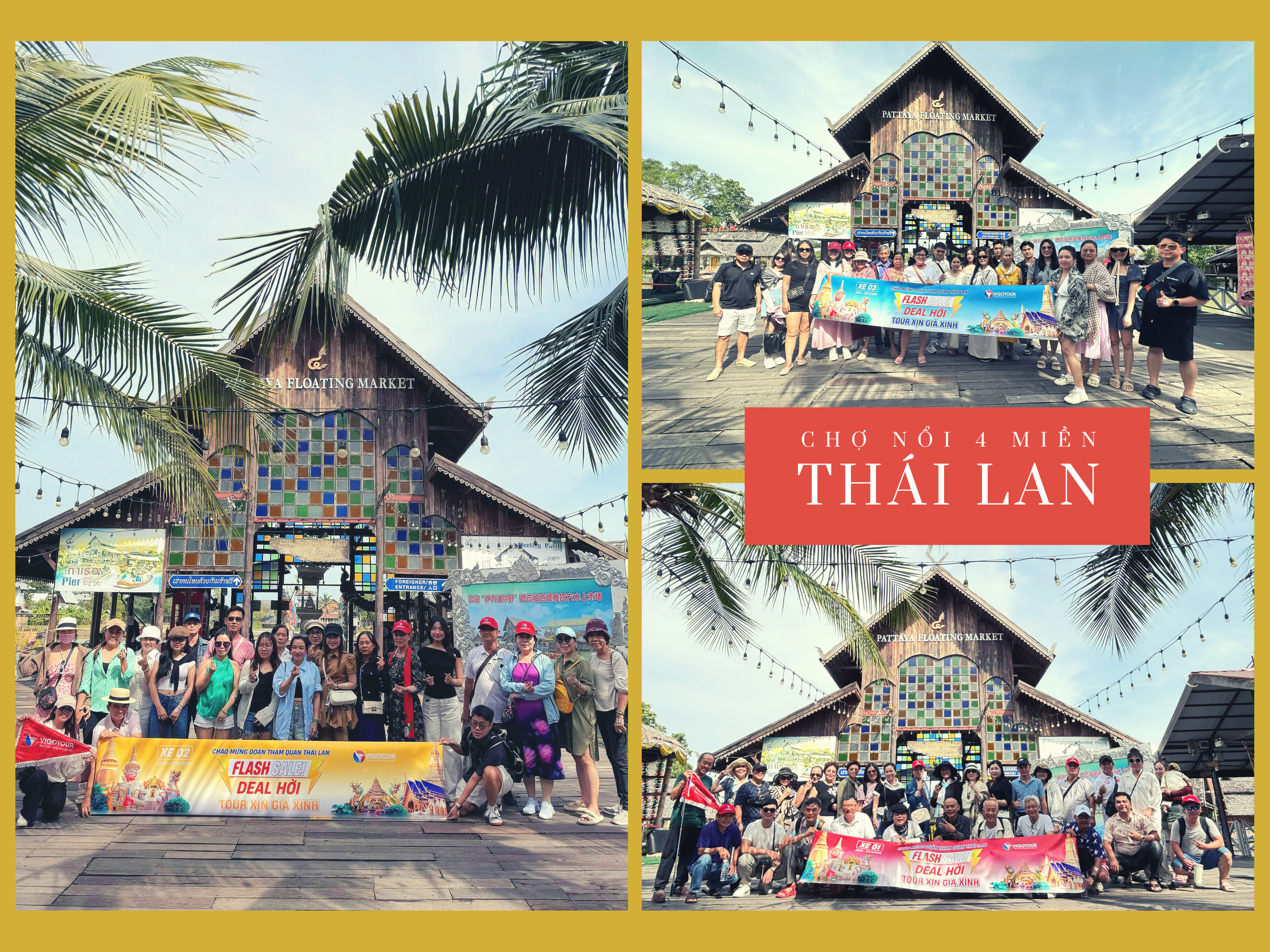 Tour Thái Lan Vigotour, đoàn tham quan các điểm nổi bật như Chùa Phật Vàng, Chợ Nổi, Pattaya, kết hợp thưởng thức ẩm thực và xem các show đặc sắc. Những hình ảnh khách vui vẻ, thoải mái ghi lại trong suốt hành trình tiếp tục là minh chứng cho chất lượng dịch vụ mà Vigotour cam kết.