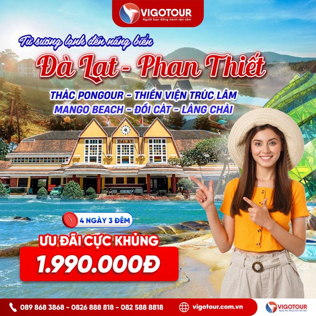 TỪ SƯƠNG LẠNH ĐẾN NẮNG BIỂN ĐÀ LẠT – PHAN THẾT THÁC PONGOUR – THIỀN VIỆN TRÚC LÂM – VƯỜN DÂU – MANGO BEACH – ĐỒI CÁT – LÀNG CHÀI Thời gian: 04...