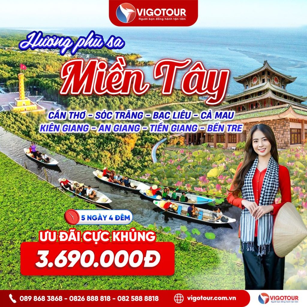 HƯƠNG PHÙ SA MIỀN TÂY CẦN THƠ – SÓC TRĂNG – BẠC LIÊU – ĐẤT MŨI CÀ MAU KIÊN GIANG – AN GIANG – TIỀN GIANG – BẾN TRE Thời gian: 05 Ngày 04 Đêm | Phương...