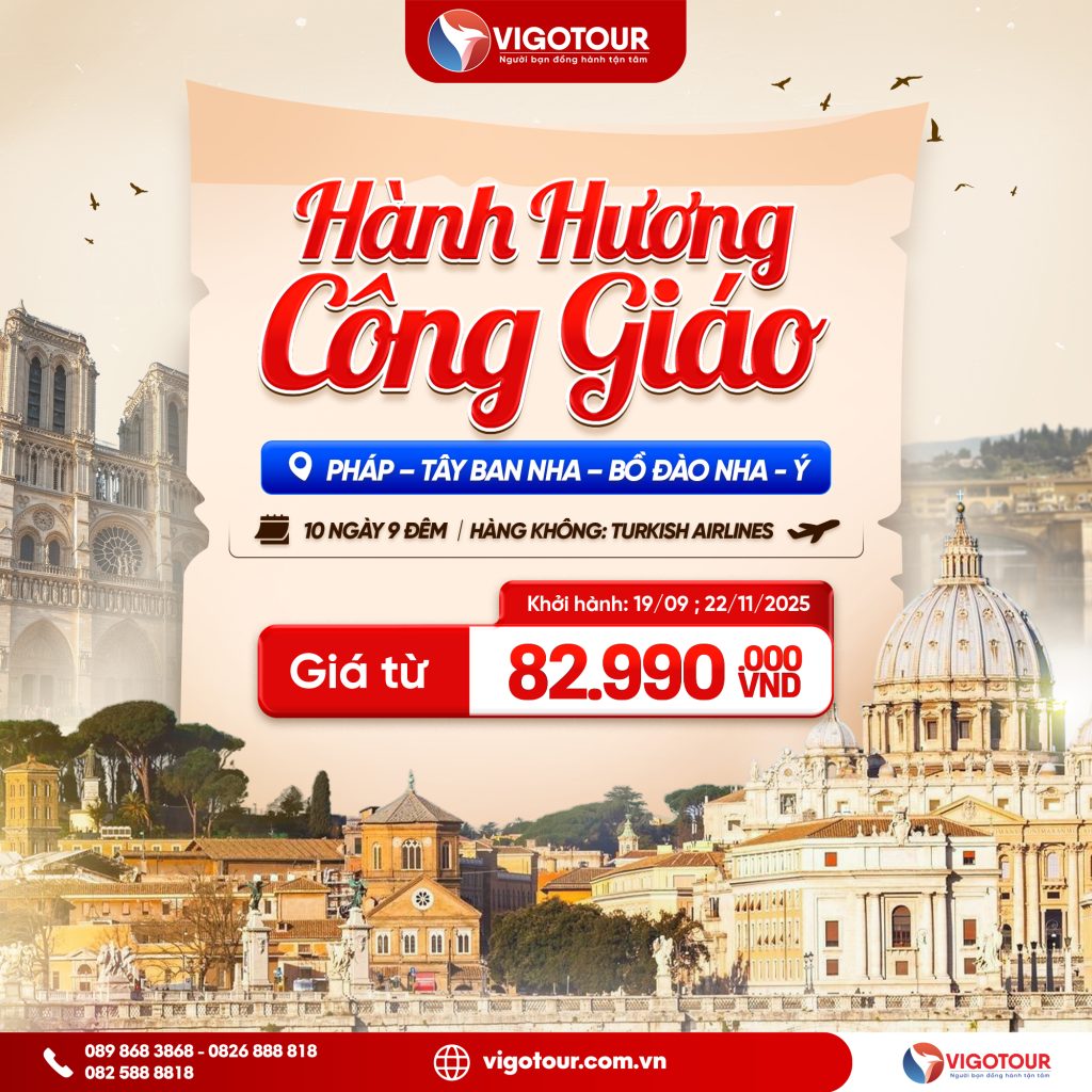 HÀNH HƯƠNG CÔNG GIÁO PHÁP – TÂY BAN NHA – BỒ ĐÀO NHA – Ý Thời gian: 10 ngày 09 đêm Khởi hành từ Sài Gòn: 19/09/2025 ; 22/11/2025 Hàng không: Turkish Airlines CÓ...