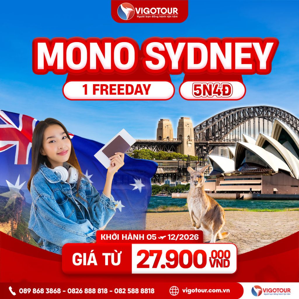 TDU LỊCH ÚC MÙA THU – ĐÔNG – XUÂN 2026 MONO SYDNEY – FREE DAY THỜI GIAN : 05 NGÀY 04 ĐÊM ĐIỂM THAM QUAN NỔI BẬT : Nhà hát Con Sò (Sydney Opera House): Biểu tượng...