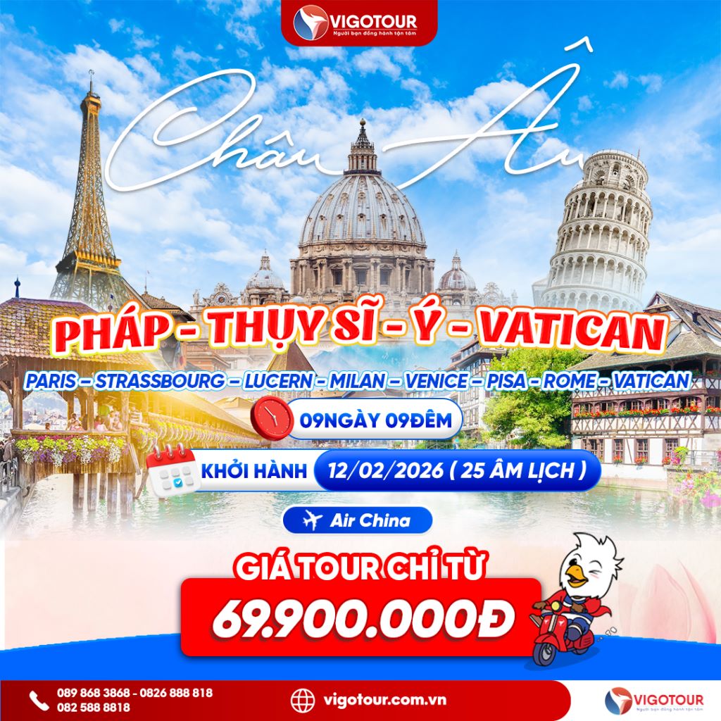 CHÂU ÂU PHÁP – THỤY SĨ – Ý – VATICAN PARIS – STRASSBOURG – LUCERN – MILAN – VENICE – PISA – ROME Thời gian: 9 Ngày – 9 Đêm (Lưu trú tại Châu Âu 8 ngày 7...