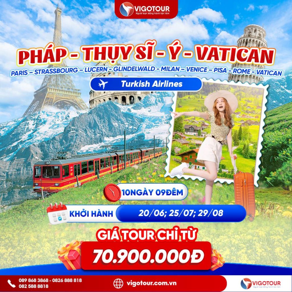 PHÁP – THỤY SĨ – Ý – VATICAN PARIS – STRASBOURG – LUCERNE – GRINDELWALD – MILAN – VENICE – PISA – ROME Ngày khởi hành: 25/09 ; 19/10 Hàng không: Turkish Airlines...