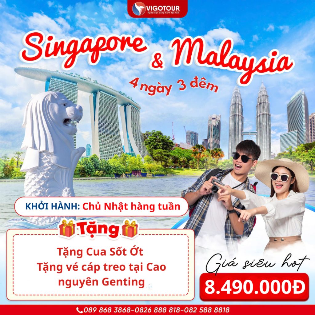 SINGAPORE – MALAYSIA 1 HÀNH TRÌNH 2 QUỐC GIA Thời gian: 5 ngày 4 đêm Hãng bay: Scoot, Air asia Điểm Tham Quan Nổi Bật Trong Chương Trình: Khách sạn 3 – 4 sao suốt...