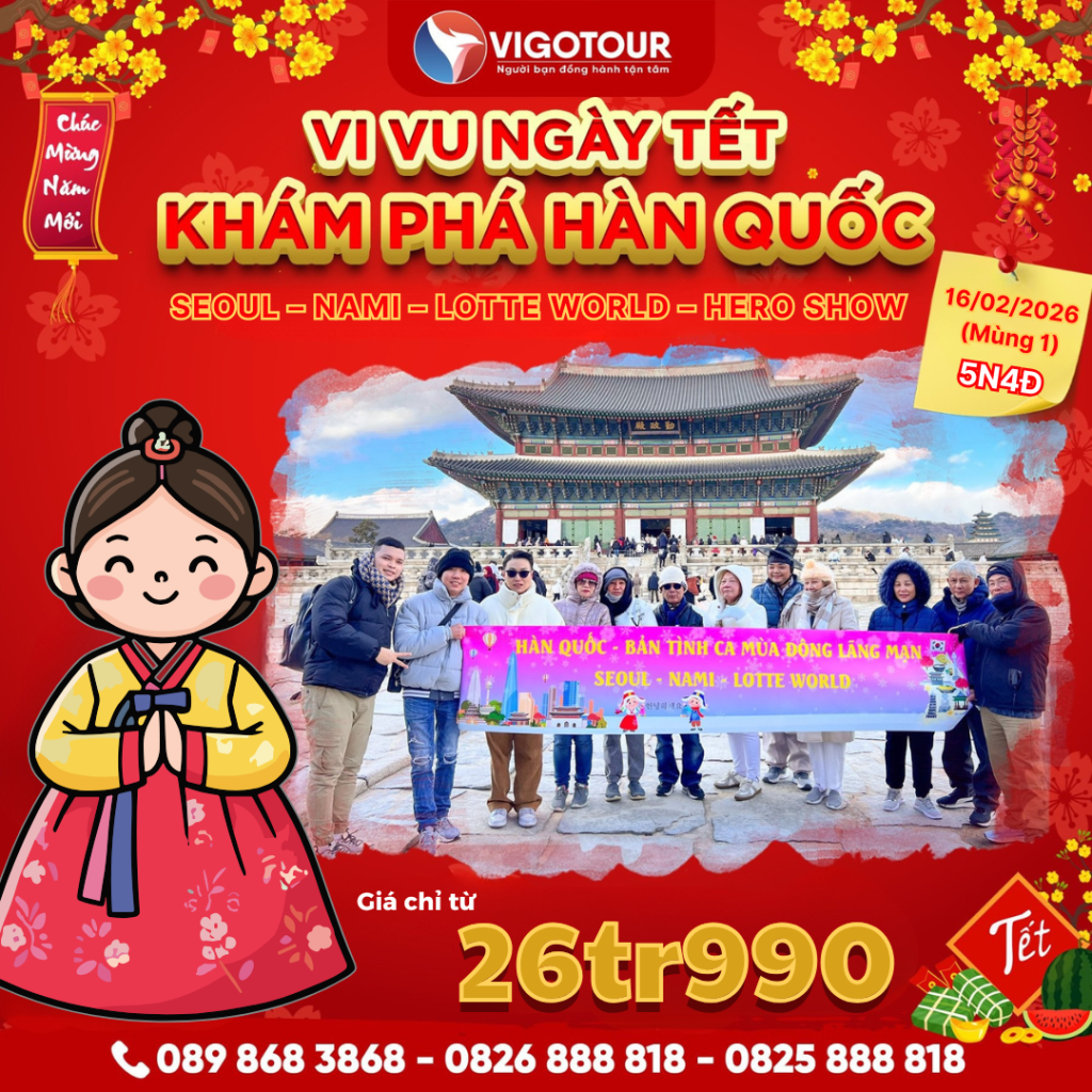 TOUR HÀN QUỐC TẾT ÂM LỊCH 2026 “SEOUL – NAMI – LOTTE WORLD – HERO SHOW” Thời gian: 05 ngày 04 đêm Hành trình tham quan trọn vẹn ngày cuối – bay về chuyến tối...