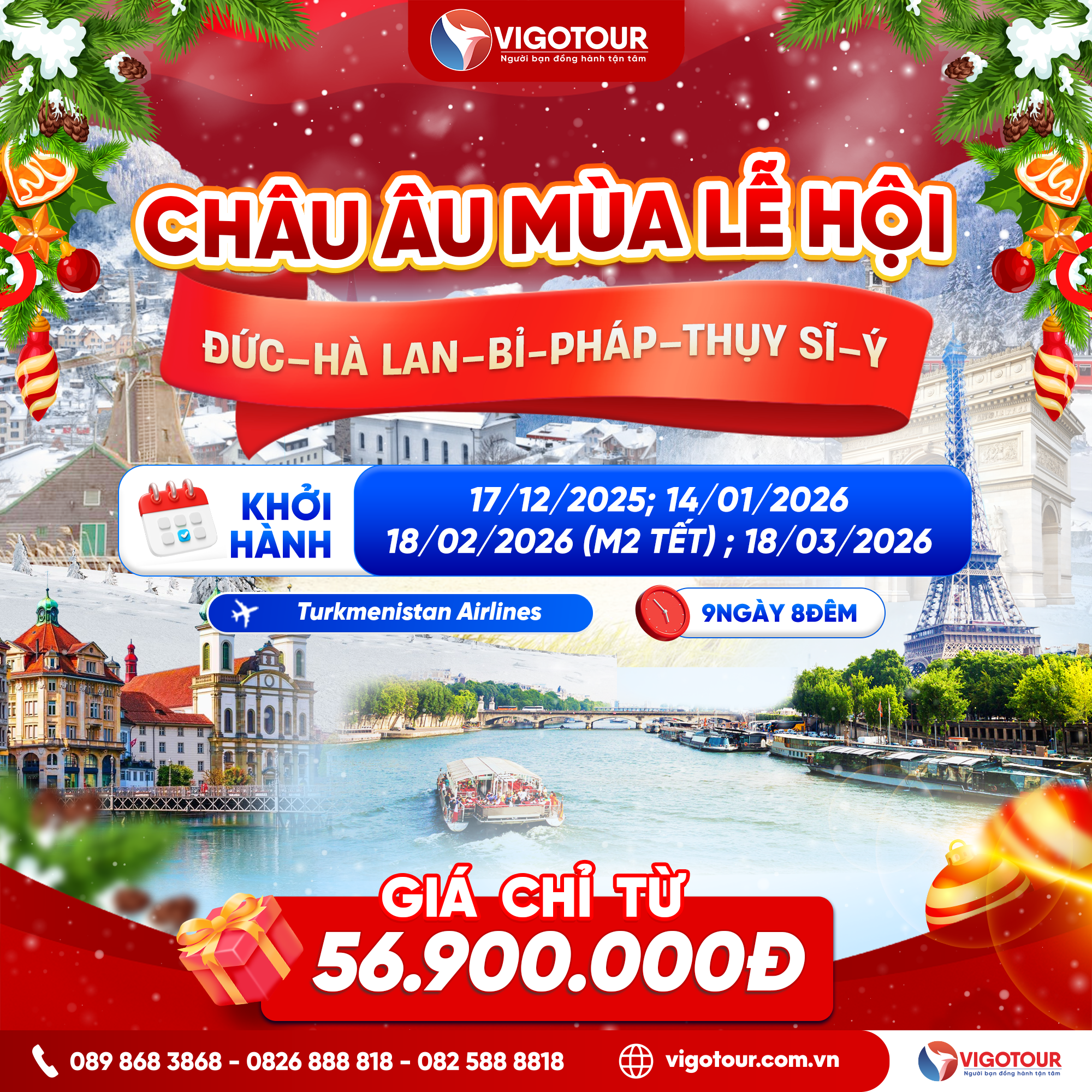 Thời gian: 09 ngày 08 đêm (Lưu trú tại Châu Âu 7 ngày 6 đêm)