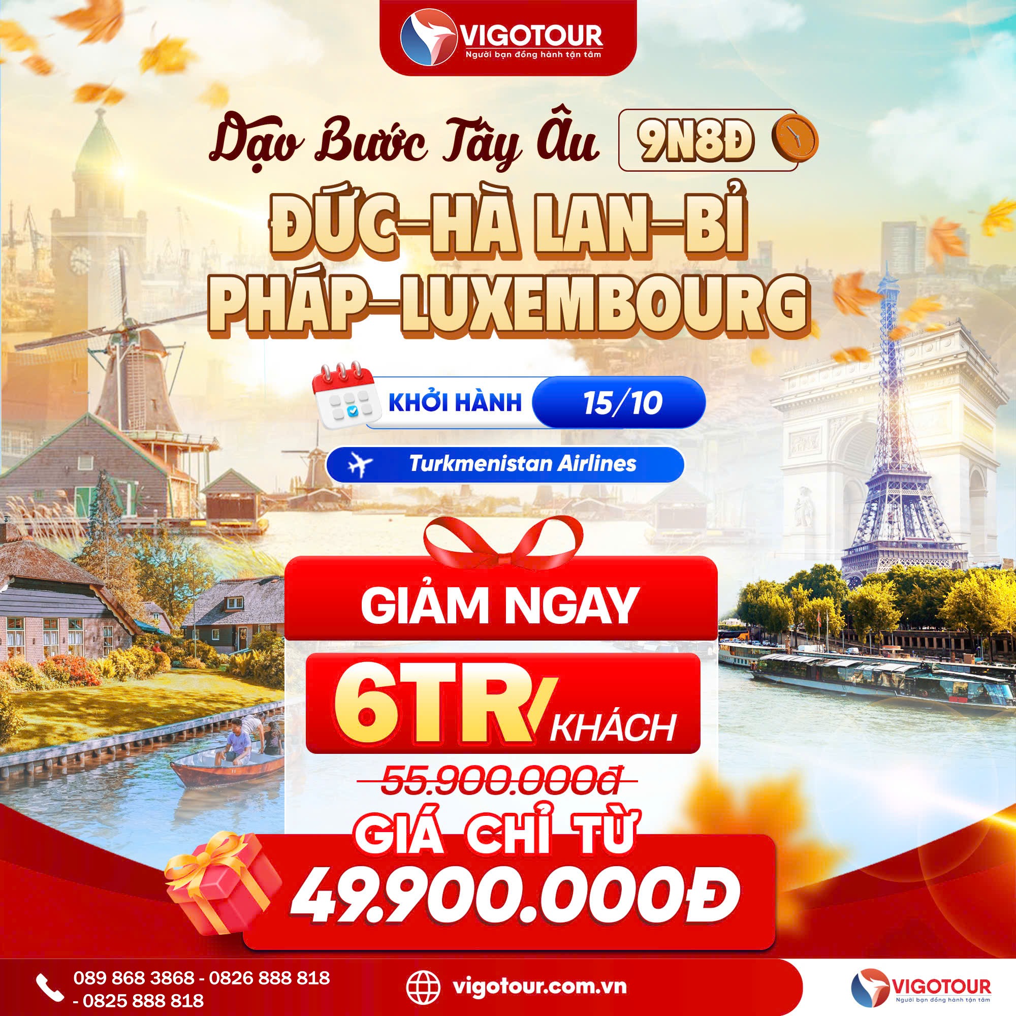 TÂY ÂU MÙA THU PHÁP – LUXEMBOURG – BỈ – HÀ LAN – ĐỨC Thời gian: 08 ngày 08 đêm – Hàng không: Air China Khởi hành: 17/10 ; 24/10 ; 07/11 – Giá tour:...