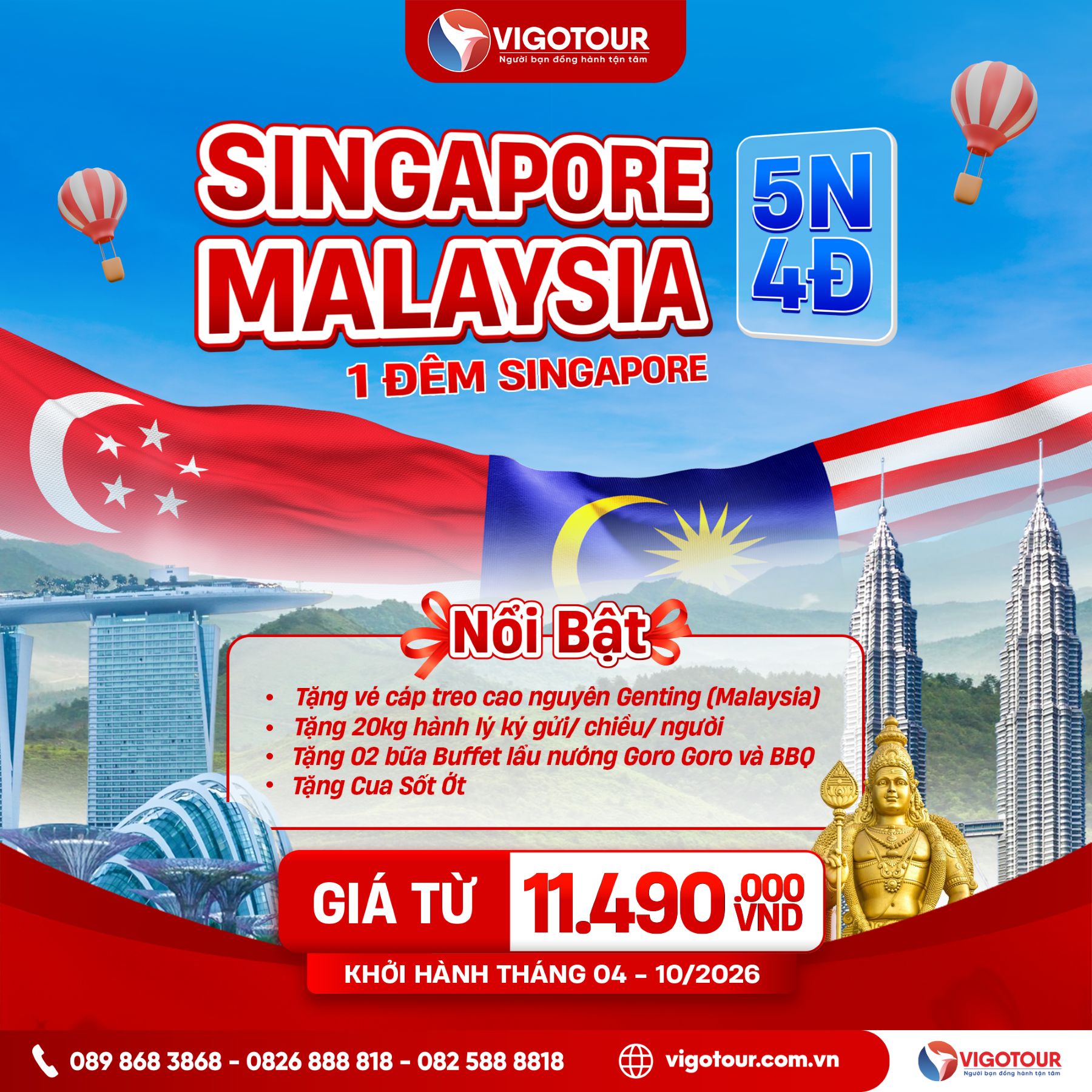 MỘT HÀNH TRÌNH HAI QUỐC GIA NĂM 2026 SINGAPORE – MALAYSIA 4N3Đ (1 ĐÊM SINGAPORE) Hãng bay: Scoot Air + Air Asia Lịch khởi hành: tháng 04 + 05 + 10 Đặc điểm nổi bật...