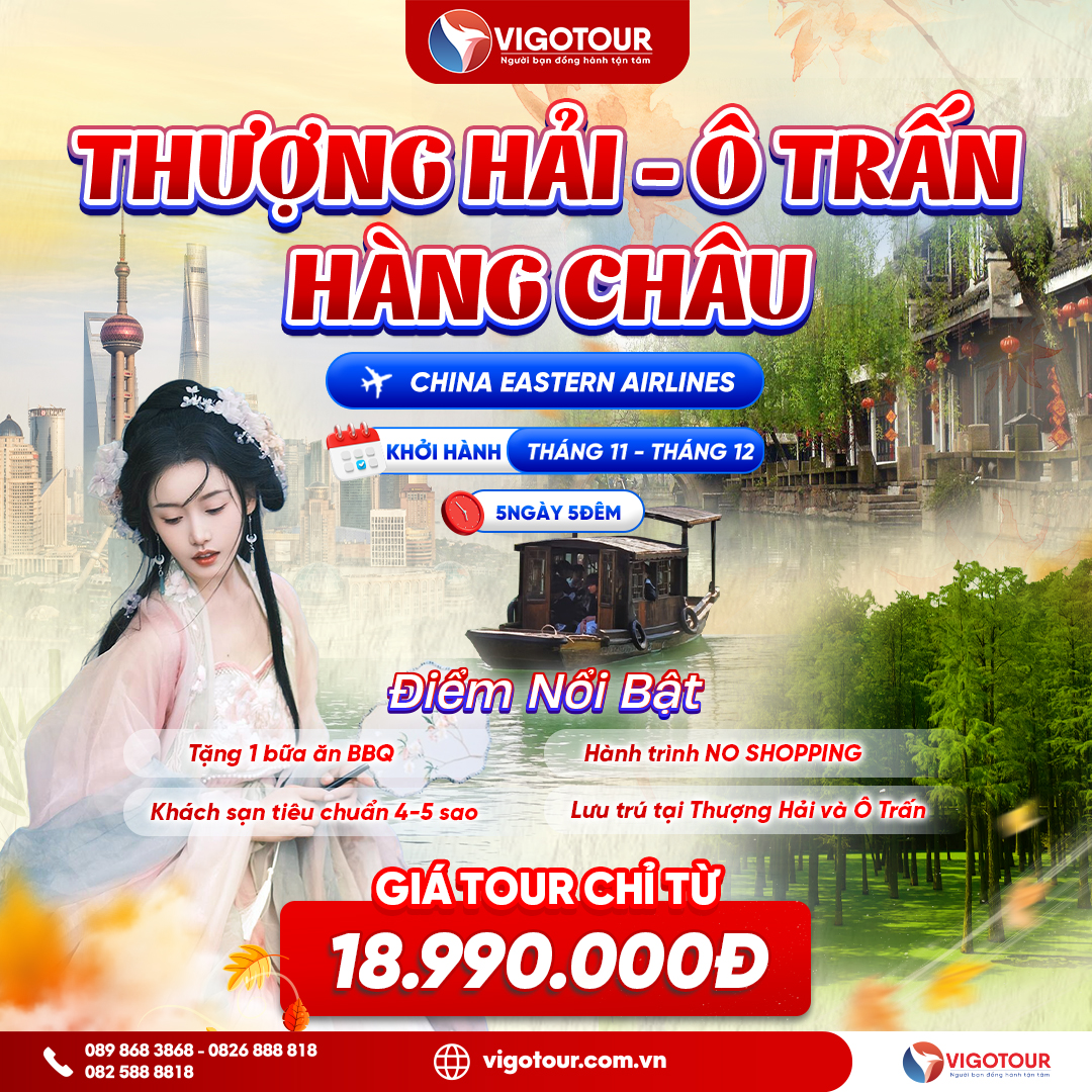 HÀNH TRÌNH TRẢI NGHIỆM TRUNG QUỐC ĐẶC BIỆT 2025 THƯỢNG HẢI – Ô TRẤN – HÀNG CHÂU – TÔ CHÂU (Option Disneyland) Thời gian: 5 ngày 4 đêm Hãng hàng không: Vietnam...