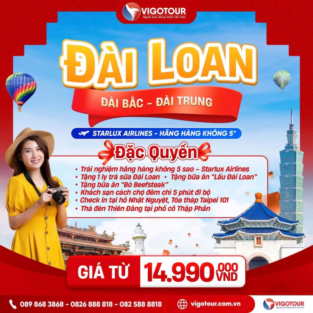 CHƯƠNG TRÌNH TOUR DU LỊCH ĐÀI LOAN 2025 ĐÀI TRUNG – CAO HÙNG – ĐÀI BẮC KHỞI HÀNH : T10, T11, T12 Thời gian: 5 ngày 4 đêm I Hãng hàng không: Vietjet Air Vigotour xin...