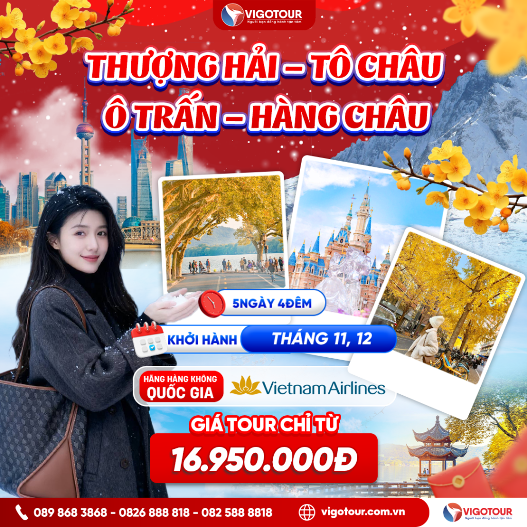 HÀNH TRÌNH TRẢI NGHIỆM TRUNG QUỐC ĐẶC BIỆT 2025 THƯỢNG HẢI – Ô TRẤN – HÀNG CHÂU – TÔ CHÂU (Option Disneyland) Thời gian: 5 ngày 4 đêm Hãng hàng không: Vietnam...