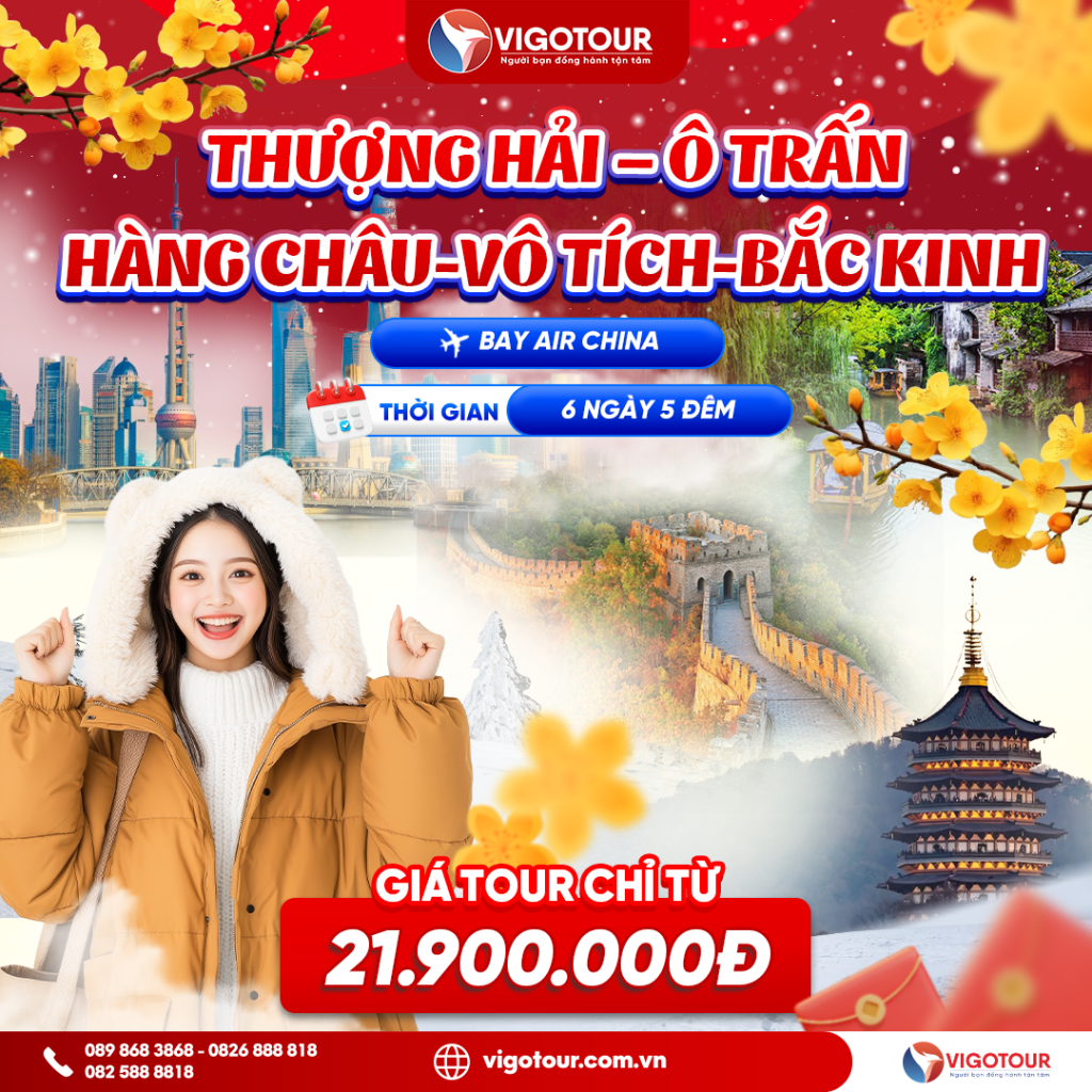Hành Trình Du Ngoạn Trung Quốc THƯỢNG HẢI – Ô TRẤN HÀNG CHÂU – VÔ TÍCH – BẮC KINH Thời gian: 06 ngày 06 đêm (1 đêm trên máy bay) Hãng hàng không: Air China (CA)...