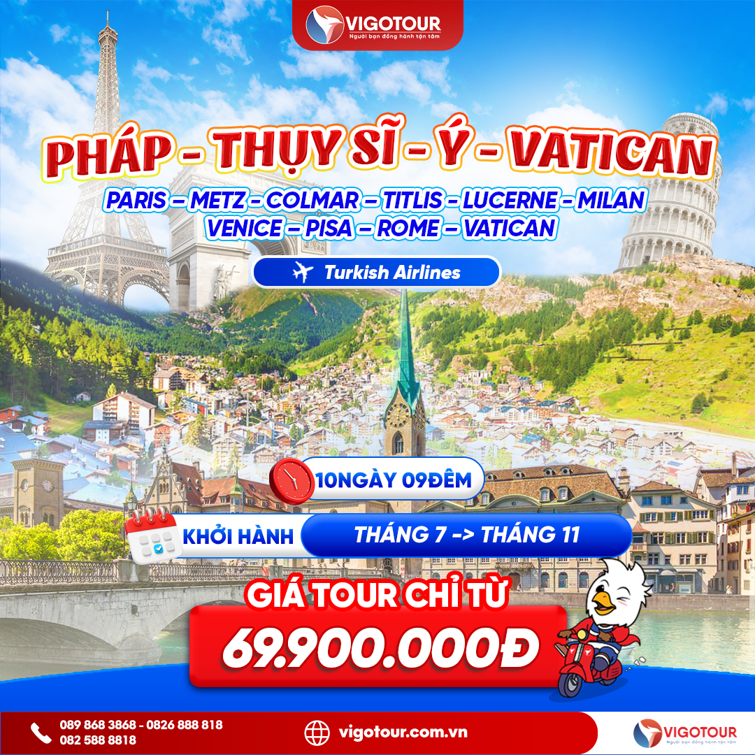 PHÁP – THỤY SĨ – Ý – VATICAN PARIS – STRASSBOURG – ZURICH – LUCERN – ZERMATT – MILAN – VENICE – PISA – ROME – VATICAN Thời gian: 10 Ngày – 9 Đêm Khởi hành:...