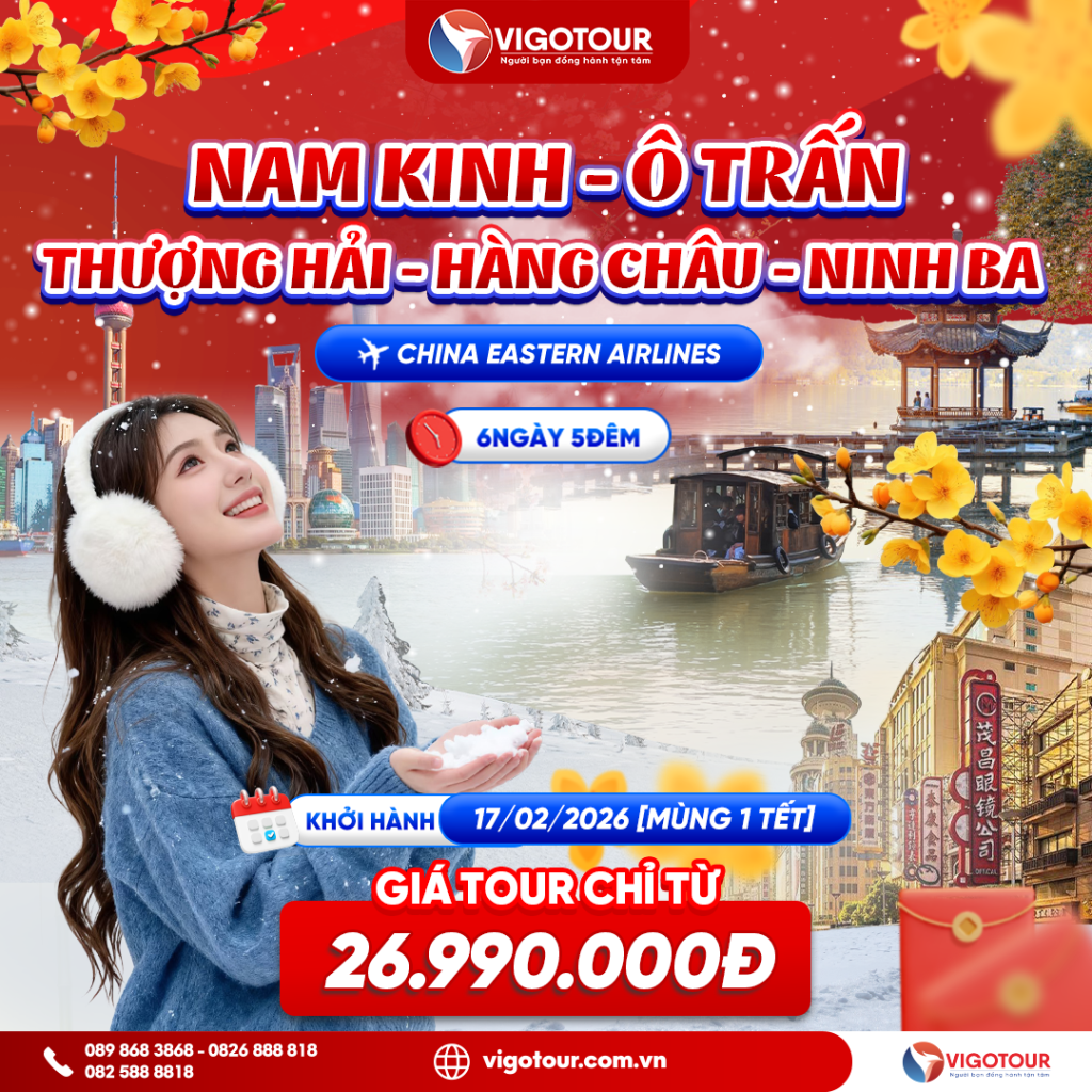 HÀNH TRÌNH TRẢI NGHIỆM TRUNG QUỐC ĐẶC BIỆT 2026 NAM KINH – Ô TRẤN – THƯỢNG HẢI – HÀNG CHÂU – NINH BA Ngày khởi hành: 17/02/2026 (M1 Tết Âm Lịch) Thời gian:...