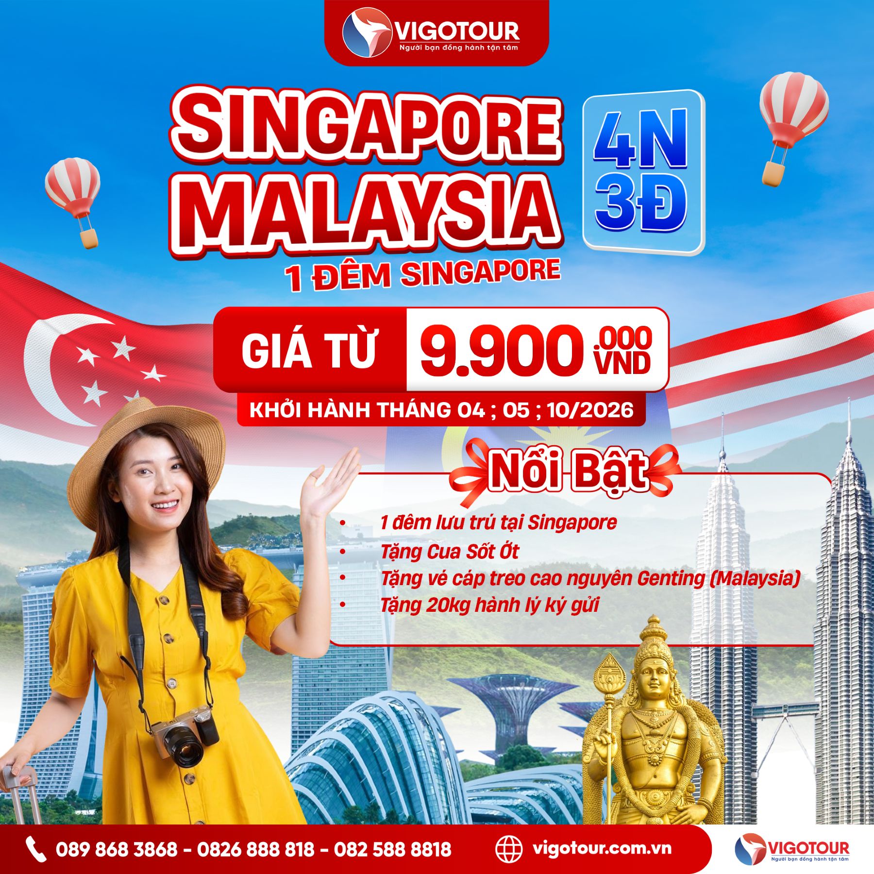 SINGAPORE – MALAYSIA 1 HÀNH TRÌNH 2 QUỐC GIA Thời gian: 5 ngày 4 đêm Hãng bay: Scoot, Air asia Điểm Tham Quan Nổi Bật Trong Chương Trình: Khách sạn 3 – 4 sao suốt...